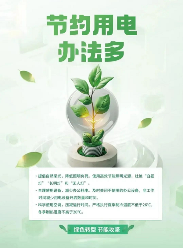 離開辦公室及其他場所時,隨手關(guān)閉電燈、電腦及其他用電設(shè)備。走廊、通道、衛(wèi)生間等公共區(qū)域白天盡量減少開燈能耗,夜間除非生產(chǎn)和安全防范需要外,其余照明一律關(guān)閉。最后離開辦公區(qū)域者,檢查工作區(qū)域照明及電器關(guān)閉情況,確保做到人走電斷。