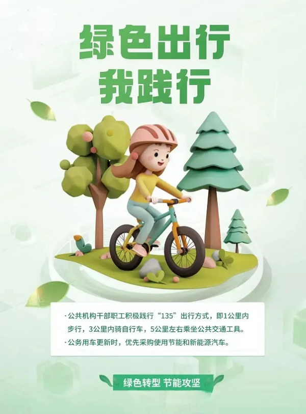 倡導(dǎo)“135”綠色低碳出行(1 公里以內(nèi)步行,3 公里以內(nèi)騎自行車,5 公里左右乘坐公共交通工具),進(jìn)一步增強(qiáng)干部職工的節(jié)能意識,以實際行動參與到節(jié)能活動中來。